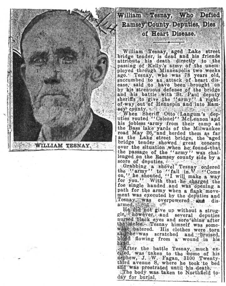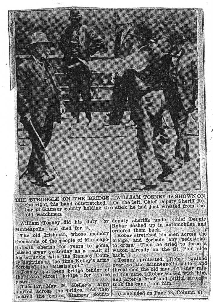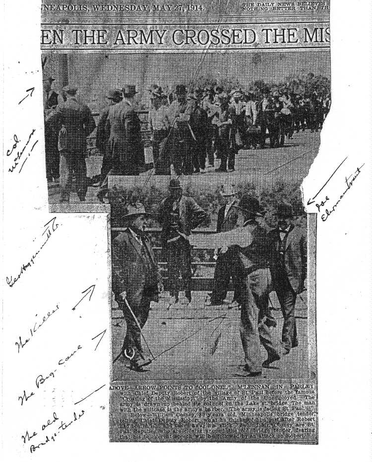 A phone message came to the Sheriff that Kelly's Army was making its way to St. Paul. I took several deputies and made a quick trip to Franklin Bridge, spanning the Mississippi River between St. Paul and Minneapolis, the route taken by the Army. I got to the center of the bridge, on came the Army some 150 strong. When within a few feet of me, I commanded, "Halt! Stop in the name of the State of Minnesota!" I asked for the leader and a handsome young fellow presented himself and stated he was Colonel McLennon, in charge of the army. I immediately detected he was a Frenchman (a Cannuck). I spoke to him in French . He answered me very fluently, told me their troubles, they were hungry and were ordered away by the Sheriff of Hennepin Co. While conversing with the Colonel, William Tesney, the Bridgetender, raised his heavy cane and threatened Joe Ehrmintraut, one of the deputies. I grabbed his cane and threw it in the river . The tender (who was about 80 years old) said he would have us arrested and he proceeded to the Minneapolis side to get the police. I told the Colonel to send two men to the sheriff's office and arrangements would be made to transport them by cars to South St. Paul and there we would see that they would be provided with grub. After consulting with the Chief of Police at Minneapolis and the Street Car Company it was arranged to convey them through South St. Paul without debarking. This was accomplished and arrangements made with Swift and Company to feed the gang.